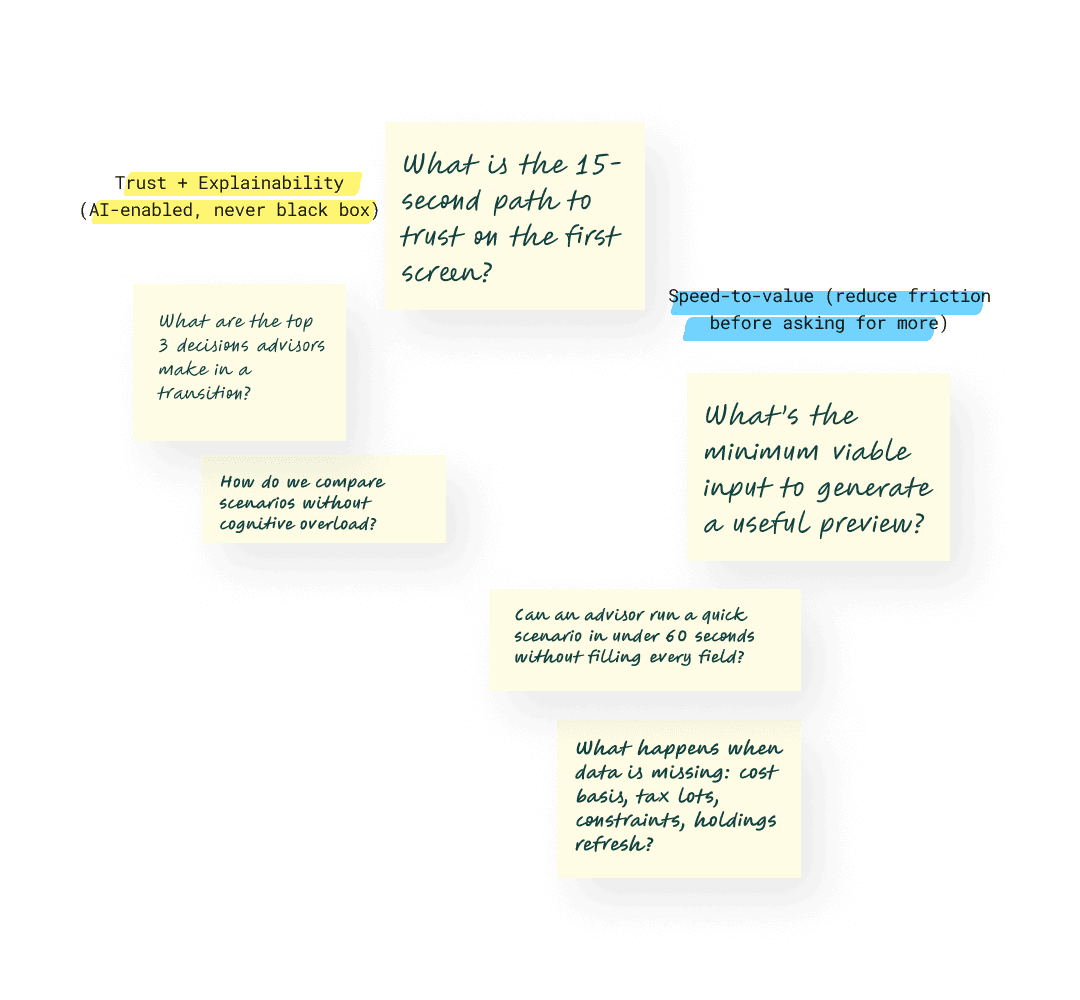 Ran structured interviews to map the full “advisor reality”: transition planning, tax implications, constraints, approvals, exports, and what gets shown to clients.