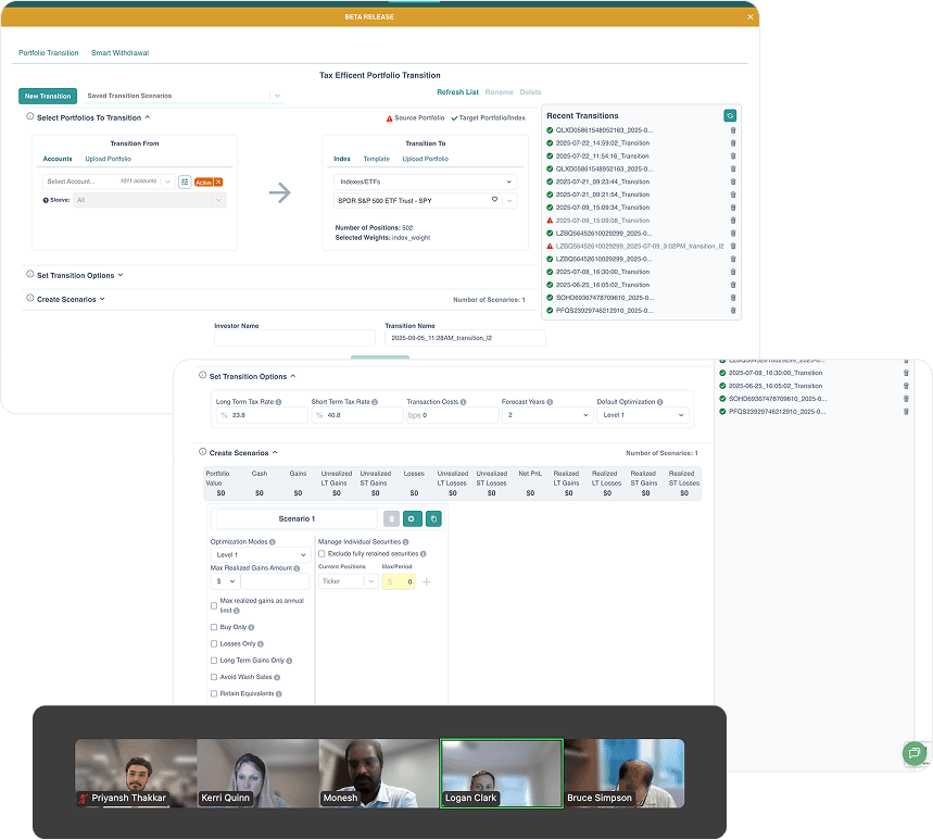 Direct indexing decisions happen under time pressure and high consequence. Advisors need to explain recommendations, defend assumptions, and move from “what if” to “I can confidently act” without getting lost in dense tax, drift, and constraint details.