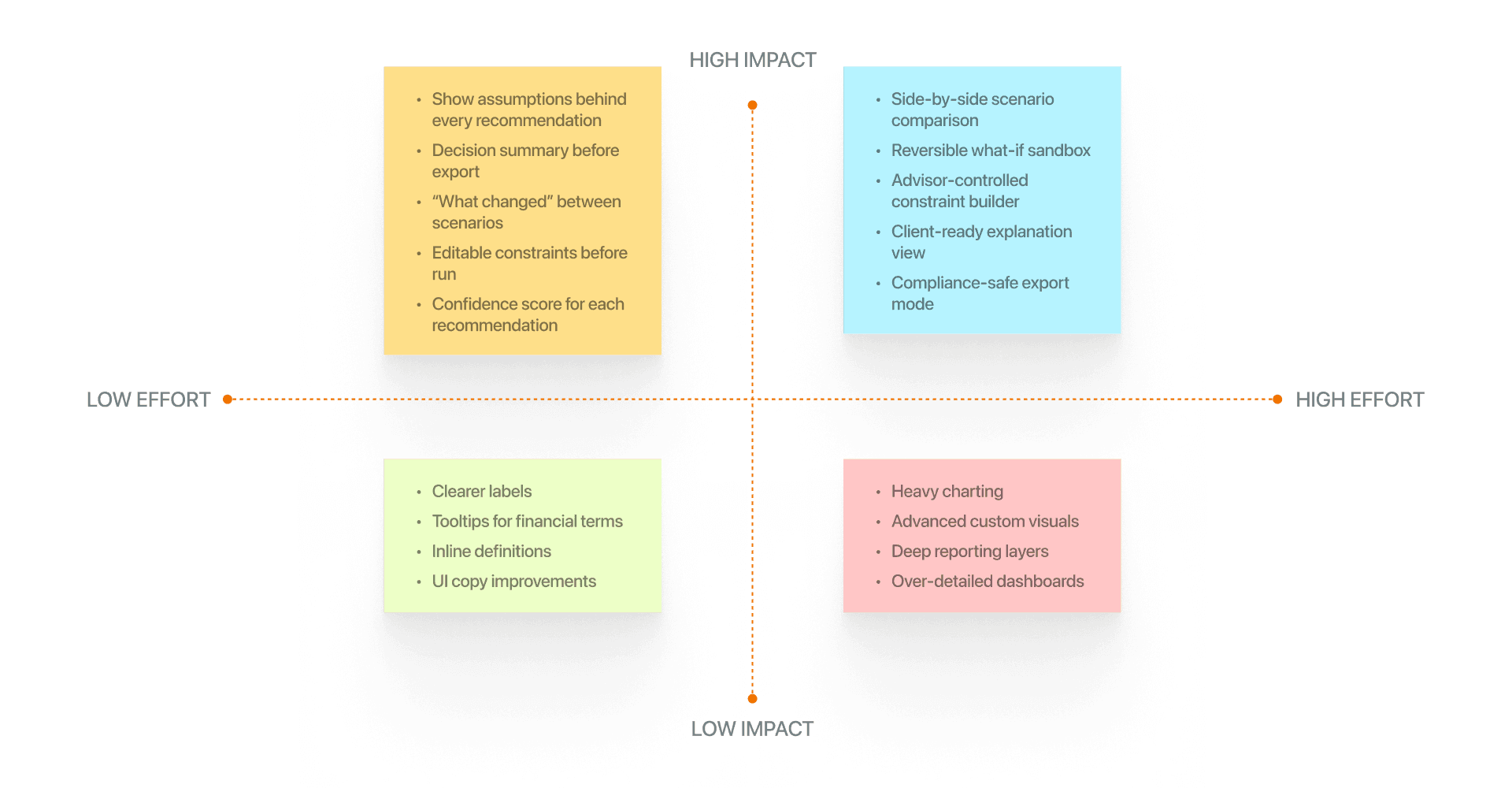 Re-ordered screens by how advisors decide: what matters, what changed, what it costs, what to do next.