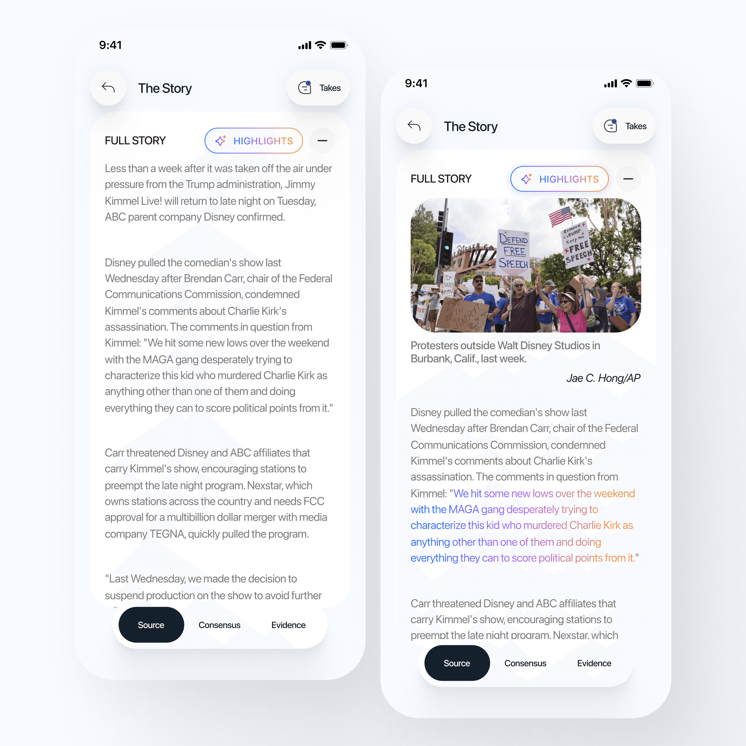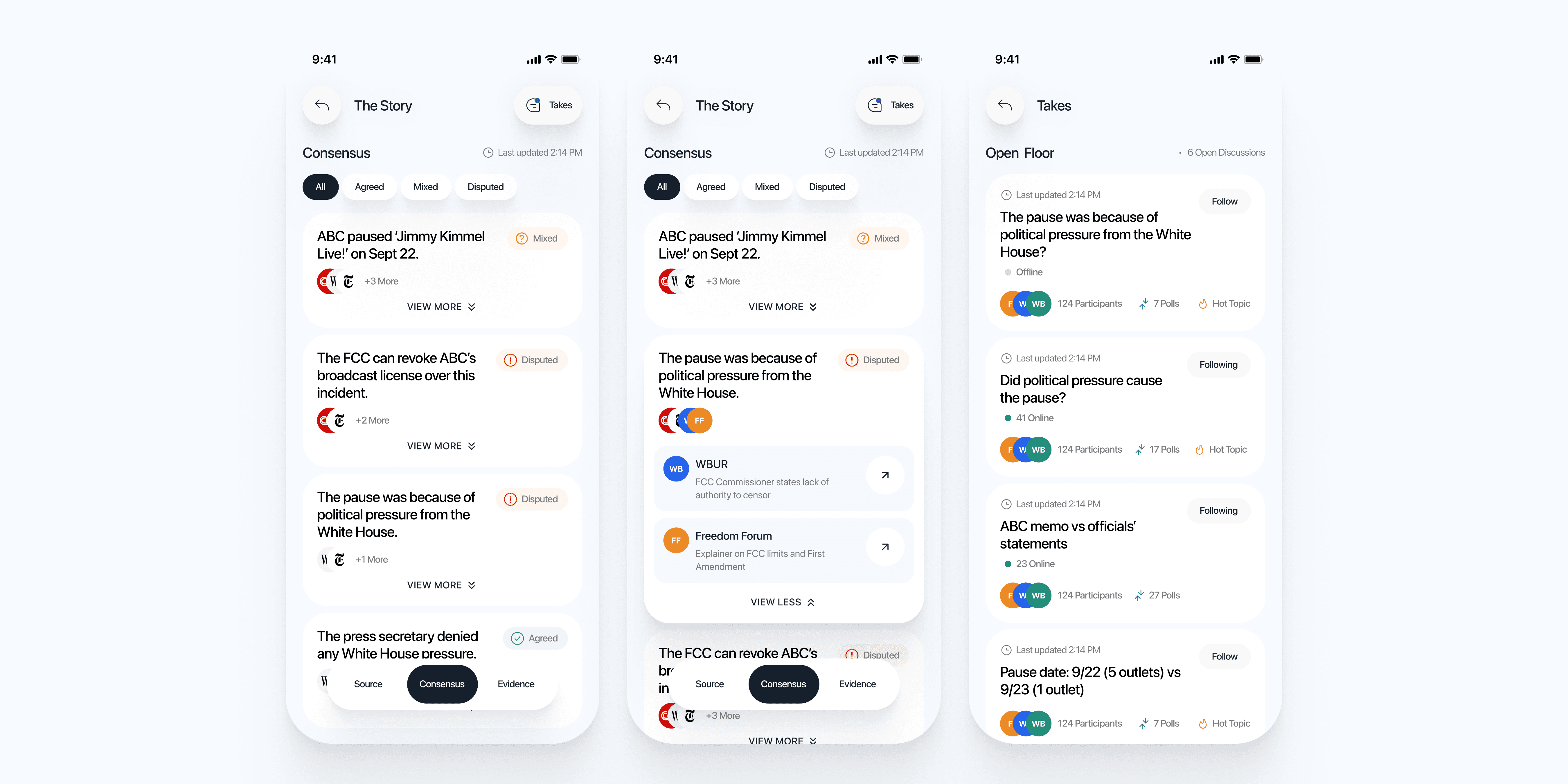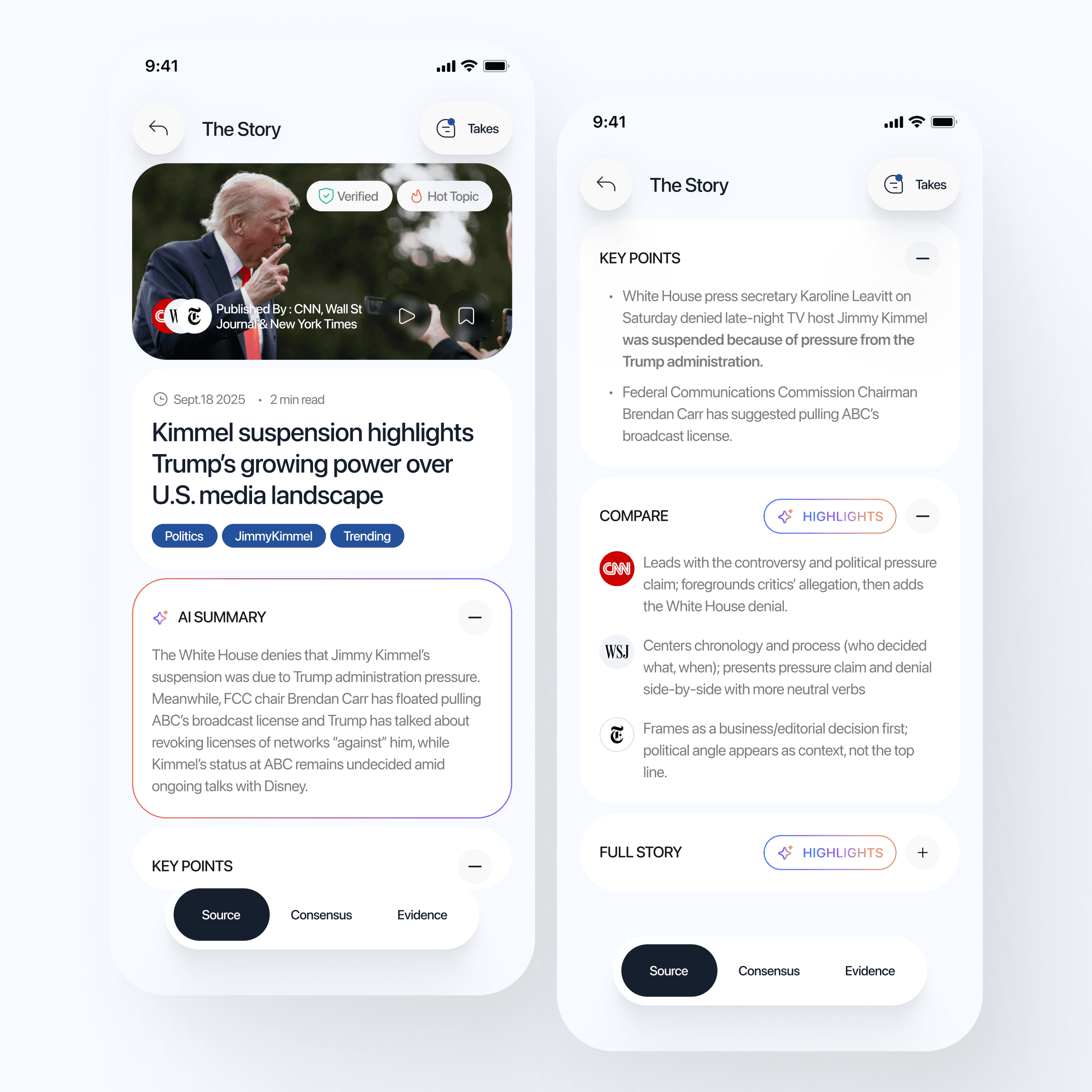 “Two taps to receipts” with clear Source, Consensus, and Evidence for any story.