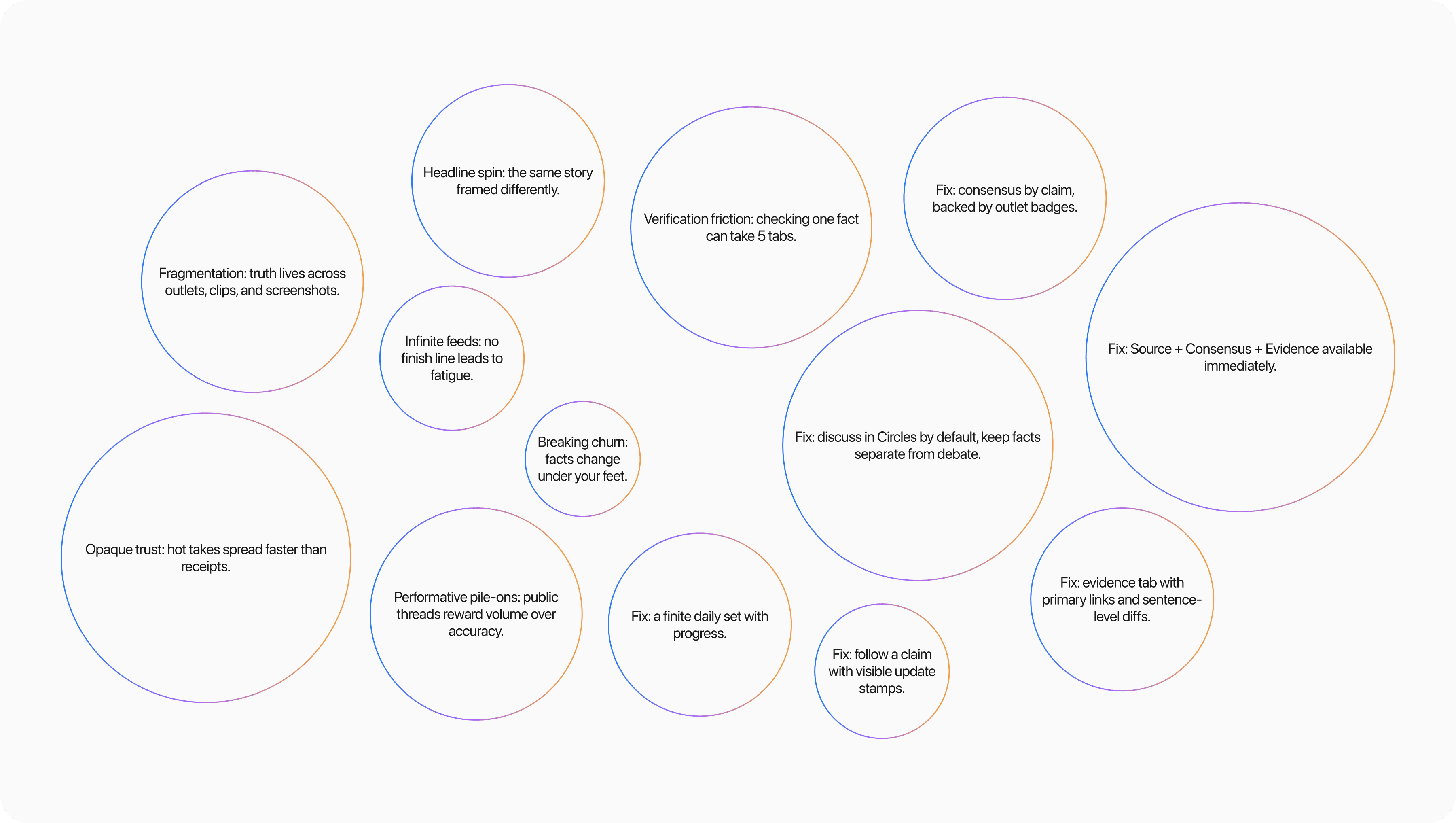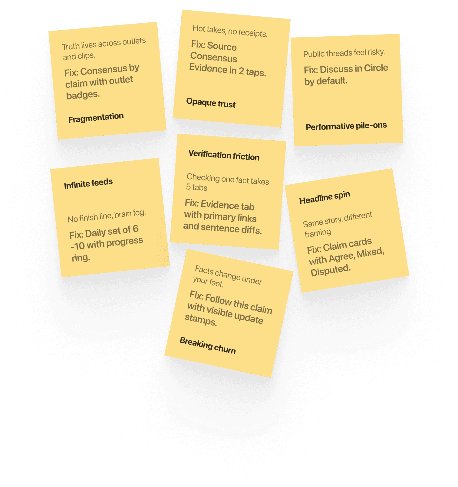 Design constraint: the smallest useful unit of truth is a claim, not a headline. Product constraint: discussion should not contaminate facts. Finite beats infinite.