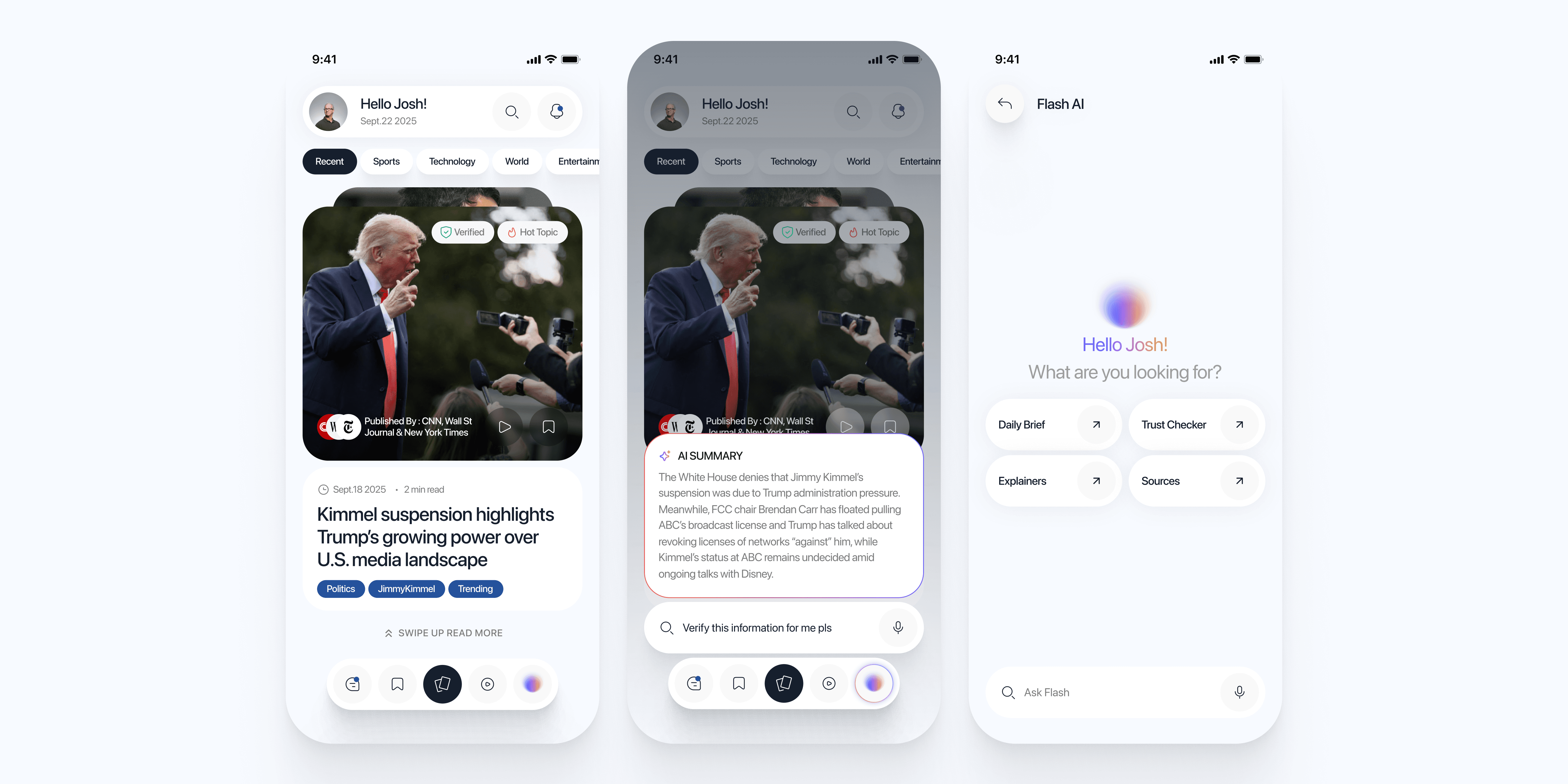 Current news apps optimize for engagement, not clarity, and bury the verification path.