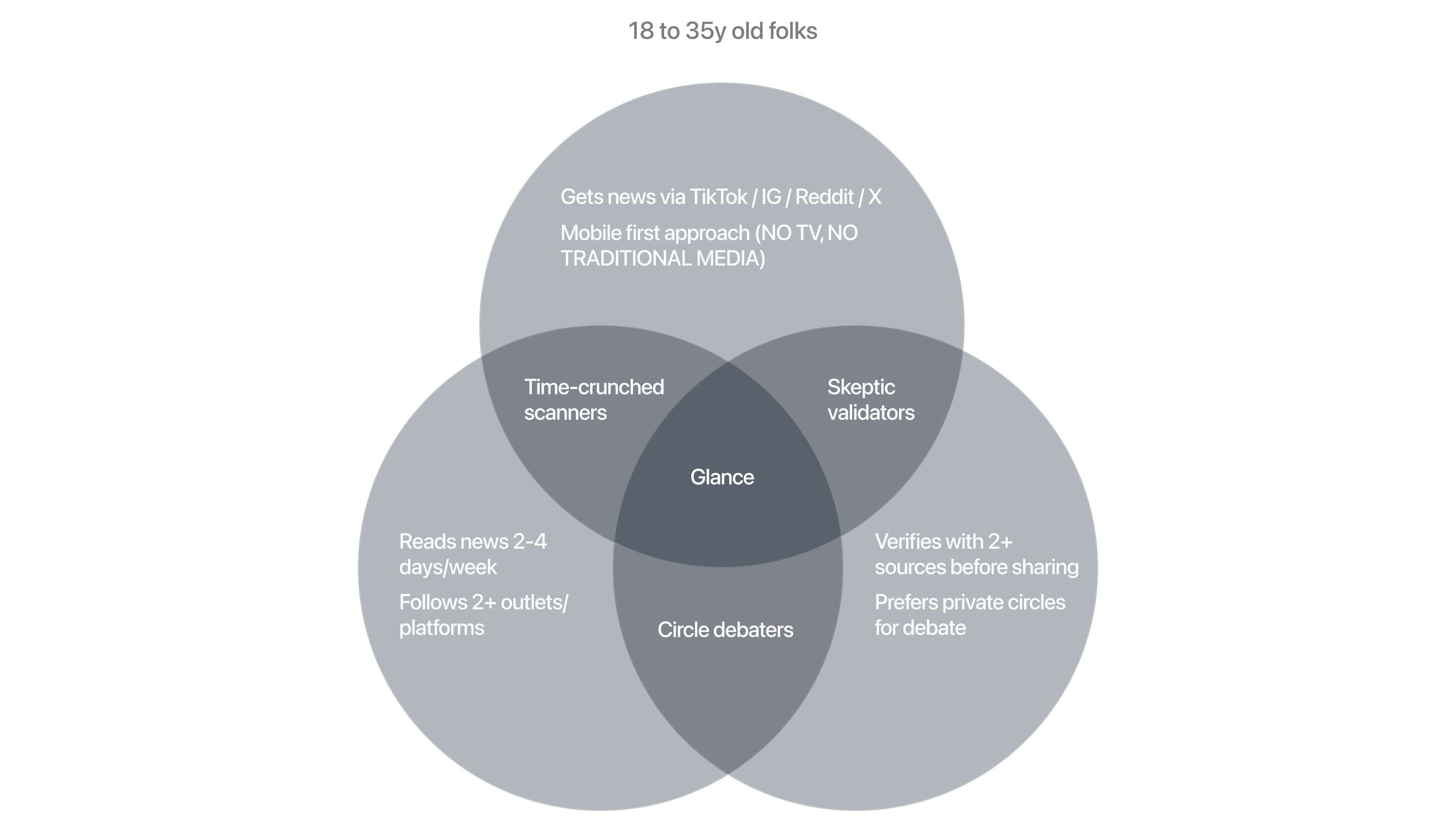 Glance was designed for 18 to 35 year olds who are mobile-first and politically mixed, and who read news at least 2 to 4 days per week while sharing in chats weekly.