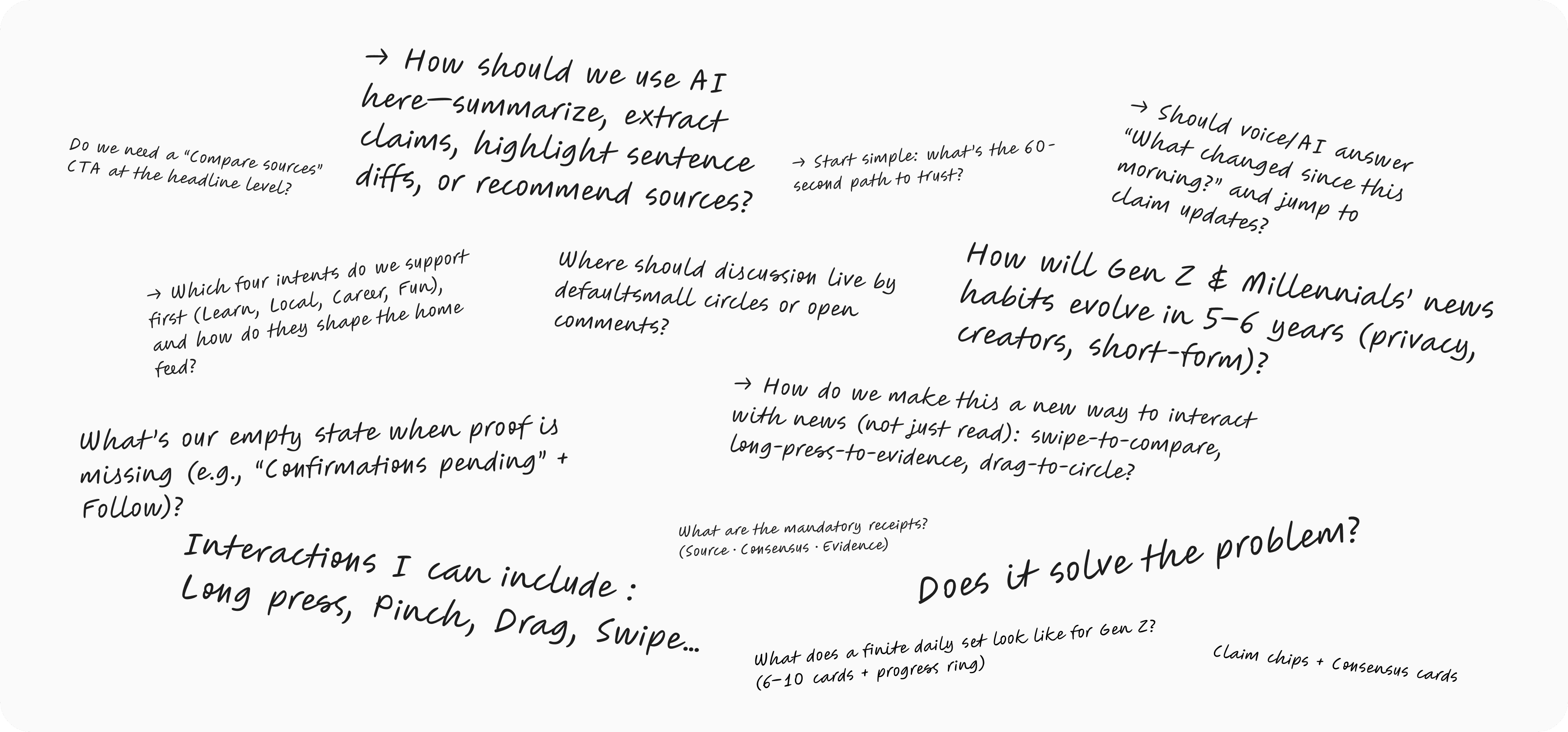 Through interviews and quick concept tests, I mapped what Gen Z and Millennial readers expect from a trust-first news experience. Users want a fast way to validate a story before they share it, without opening multiple tabs. They expect clear receipts, simple language, and a lightweight path to compare how different outlets frame the same claim.