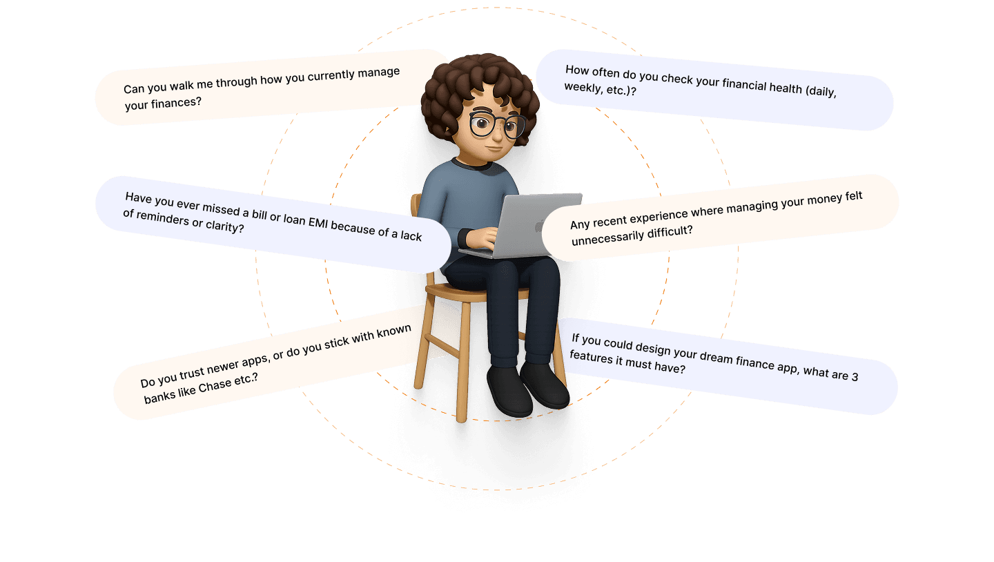Through one-on-one conversations with real users, we uncovered pain points like the frustration of toggling between multiple finance apps and the desire for a single, guided platform. Interviews helped us surface unspoken needs and emotional triggers such as anxiety around bills and investments. These insights grounded our UX strategy in real human experiences.
