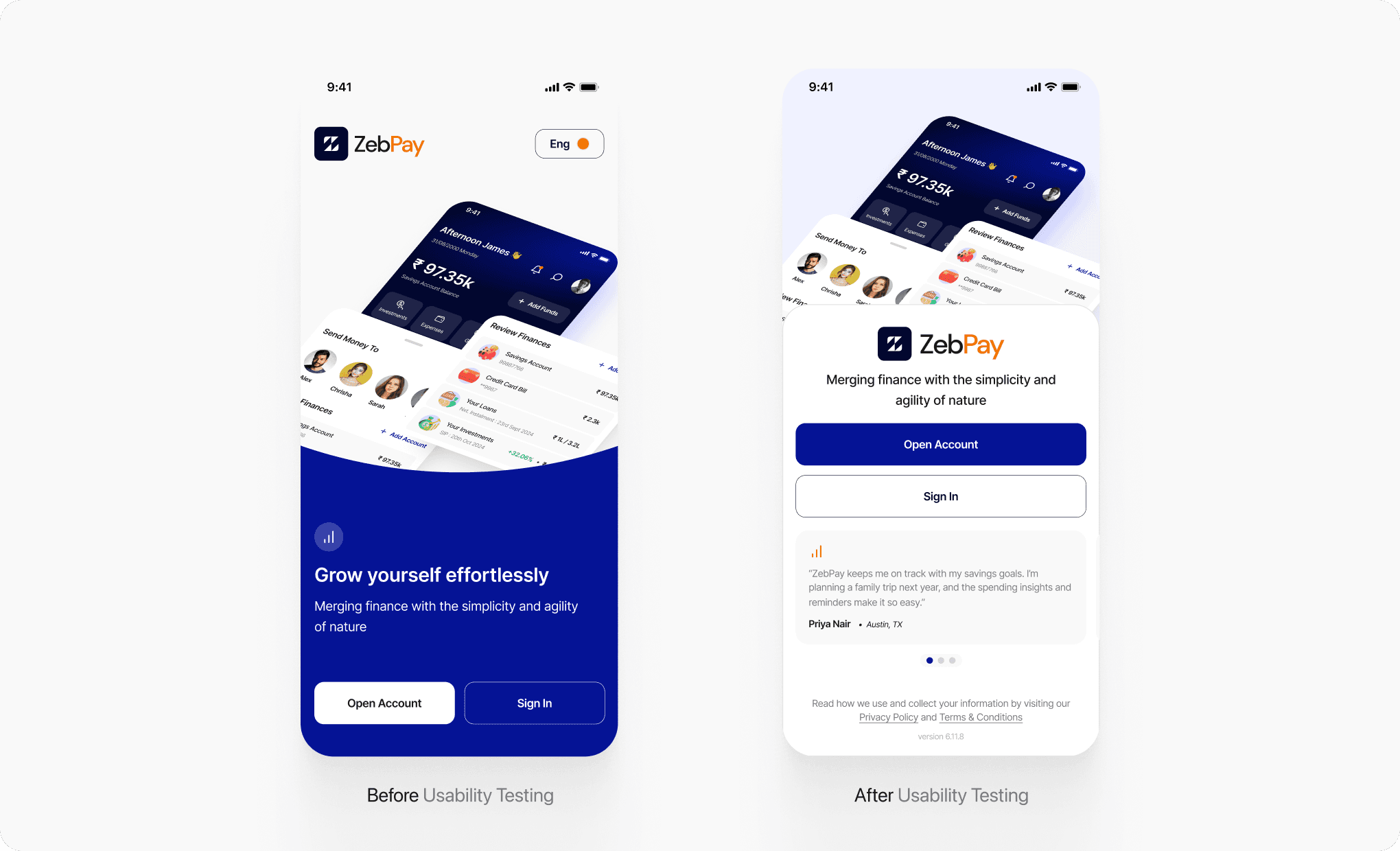However, the original splash screen featured an oversized dashboard graphic, pushing CTAs below the primary interaction zone, resulting in users taking longer to locate the “Open Account” or “Sign In” buttons.