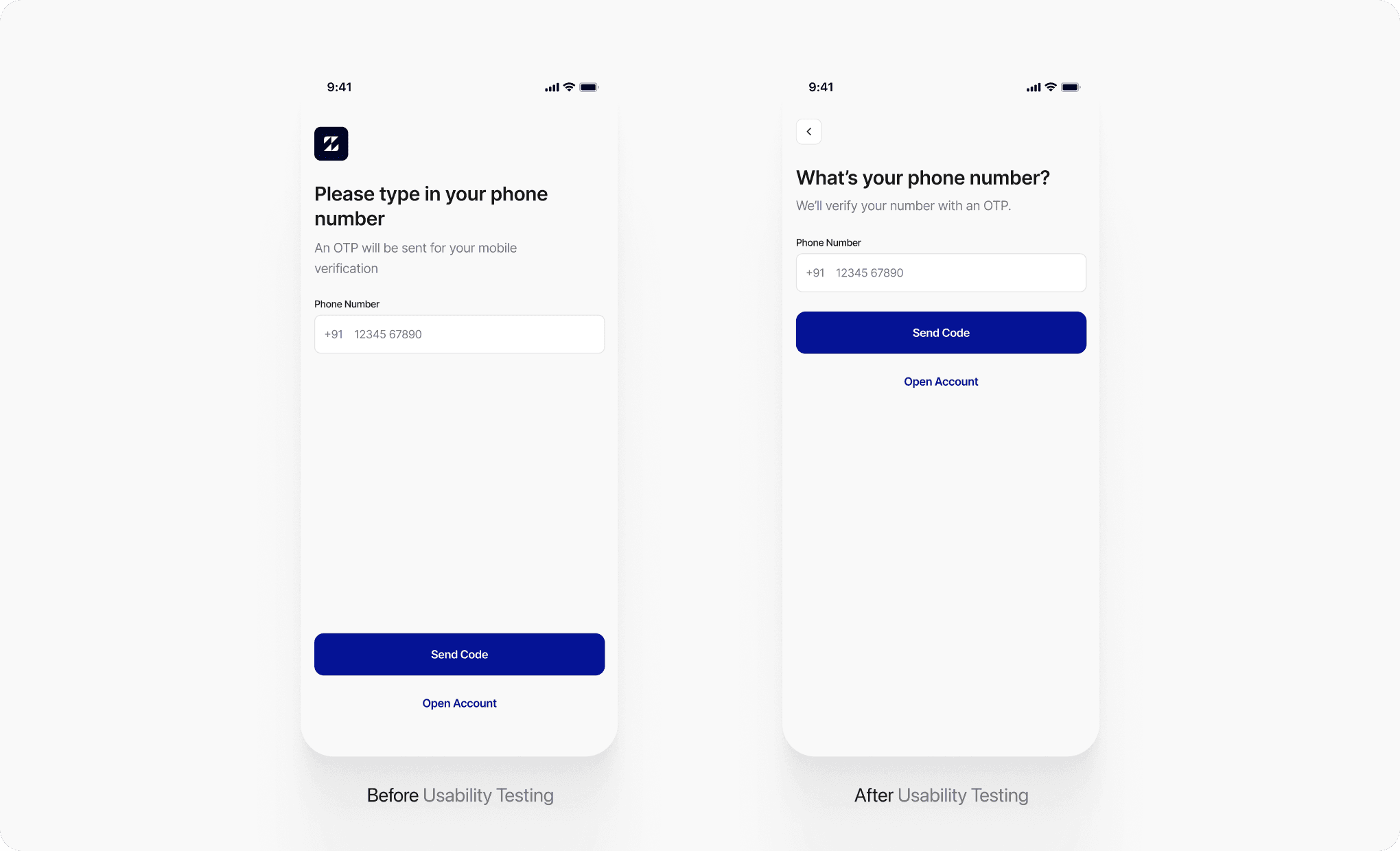 Enhanced heading and subtext hierarchy for faster comprehension—switching to “What’s your phone number?” made it sound more natural and human.