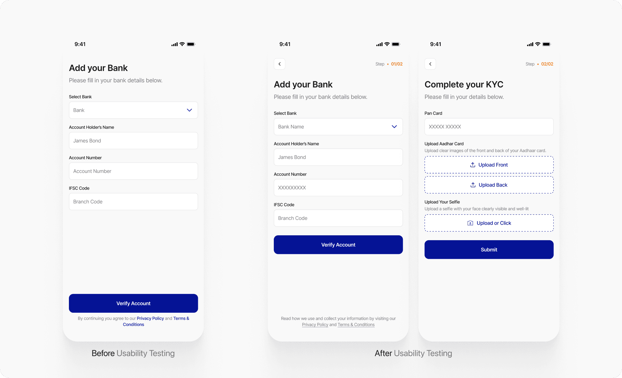 KYC Added as a Natural Progression: Instead of ending after bank details, users are taken to a new screen to complete KYC—making the process linear and goal-driven.